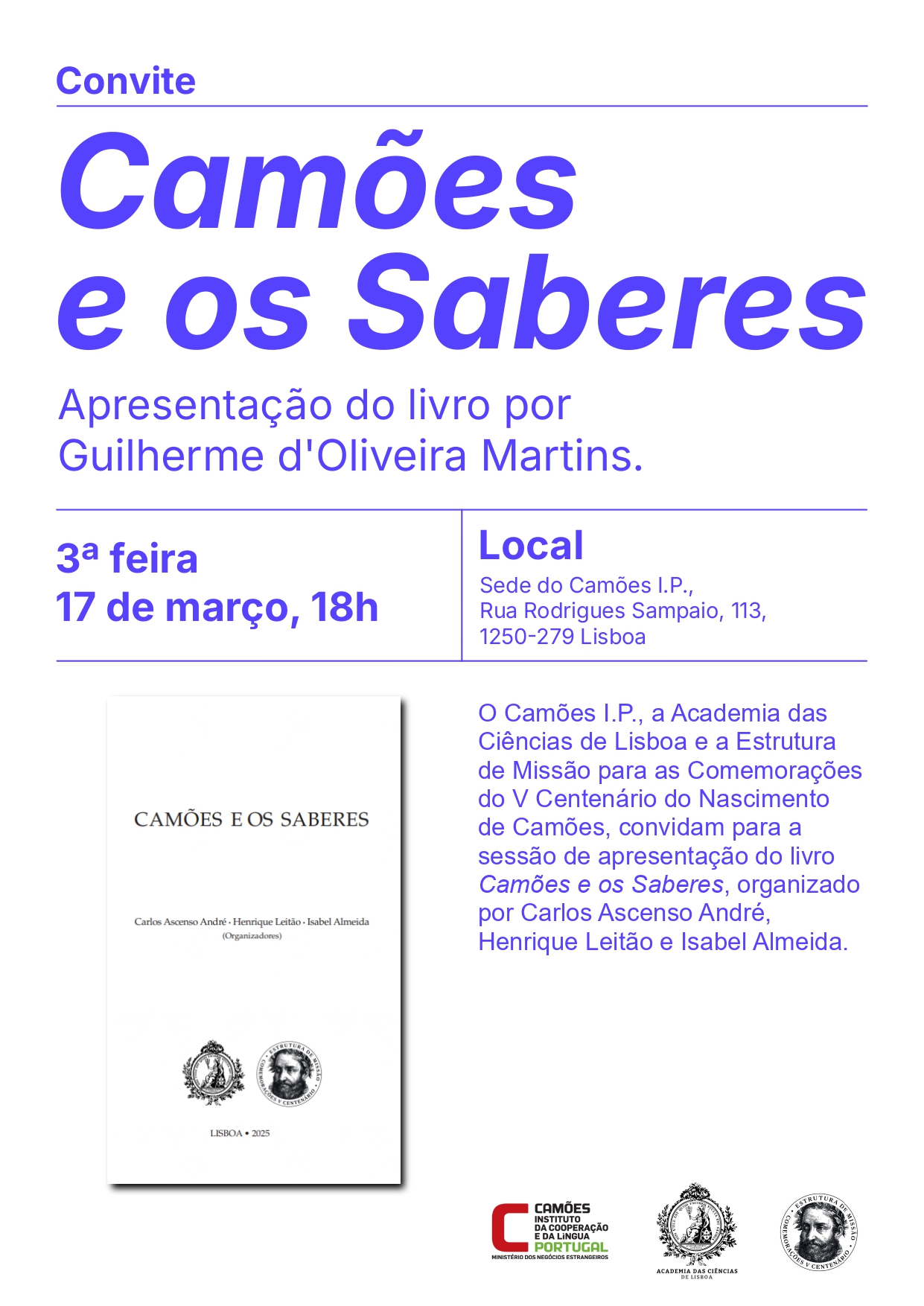 No dia 17 de março de 2026, às 18h00, realiza-se a cerimónia de apresentação do livro “Camões e os Saberes”, coordenado por Carlos André, Henrique Leitão e Isabel Almeida. A obra é uma edição da Academia das Ciências de Lisboa, com o apoio da Estrutura de Missão.