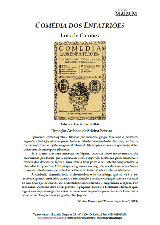 O Teatro Maizum estreia, como o apoio da Estrutura de Missão, a 3 de junho de 2026 a peça “Comédia dos Enfatriões”, de Luís de Camões, com direção artística e encenação de Silvina Pereira.