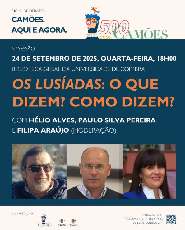 No dia 24 de setembro de 2025, às 18h00, na Sala de São Pedro, da Biblioteca Geral da Universidade de Coimbra, realiza-se o quinto debate do ciclo Camões. Aqui e Agora, dedicado ao tema «Os Lusíadas: O que dizem? Como dizem?».